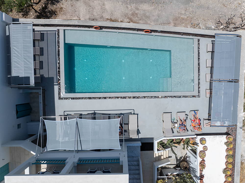 Unser großer Pool bietet den idealen Rahmen zum Schwimmen, Sonnenbaden und Faulenzen. Die bequemen Sonnenliegen schaffen ein Gefühl von Ruhe und Entspannung, während Sie Ihren Tag in der heißen Sommersonne genießen.